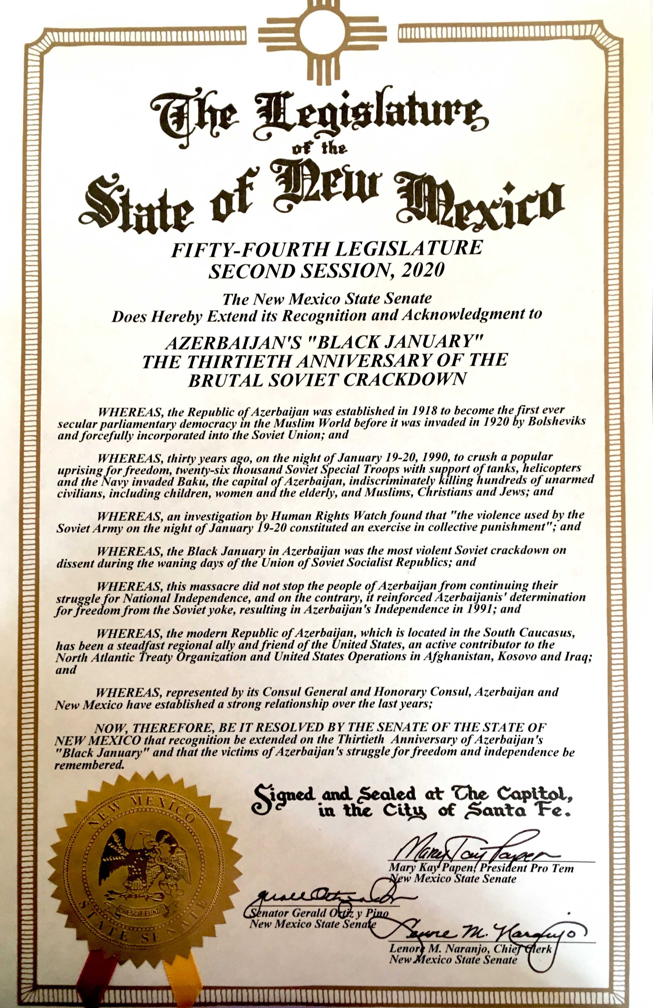 ABŞ-ın Nyu-Meksiko Ştat Senatı fevralın 4-də Qara Yanvar faciəsinin 30-cu ildönümü ilə bağlı geniş bəyannamə qəbul edib.