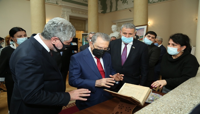 Əvvəlcə “Nizami Gəncəvi İli”ndə AMEA-da nəşr edilmiş kitabların və rəsm əsərlərinin sərgisinə baxış keçirilib.