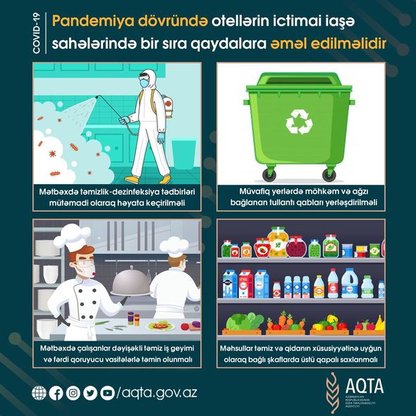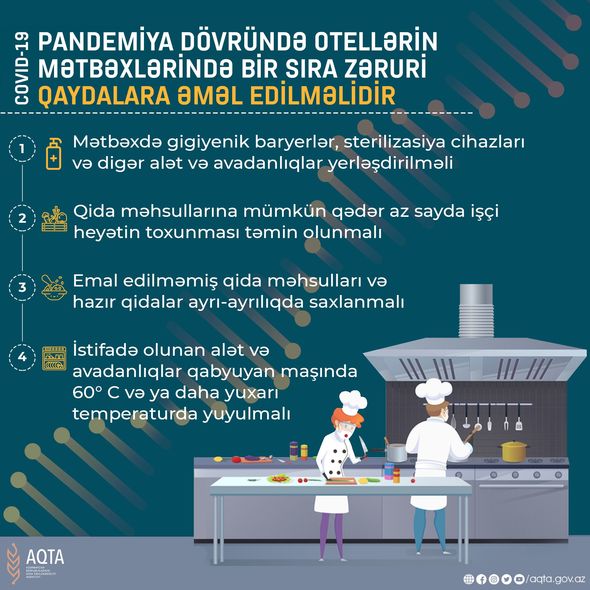 Mehmanxanaların ictimai iaşə zonalarında – mətbəxdə işçi heyətin şəxsi gigiyenaya əməl etməsi, yeməklər hazırlanarkən termiki emala riayət olunması, o cümlədən xam məhsulların istifadədən əvvəl təmizlənməsi, yemək dəstlərinin, mətbəx avadanlıqlarının, çirkli səthlərin mütəmadi olaraq yuyulub, təmizlənməsi təmin olunmalıdır.