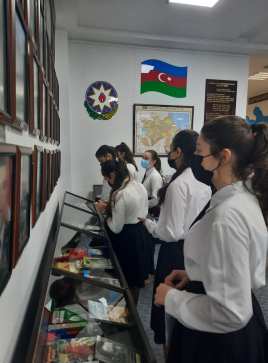 Şagirdlər Azərbaycan kitabxana sistemində bir ilk olan Birinci və İkinci Qarabağ müharibəsində iştirak etmiş şəhidlərimiz haqqında məlumatların, sənədlərin, kitabların, fotoşəkillərin mühafizə edildiyi “Qarabağ müharibəsi qəhrəmanları” fondunda olublar. Fondda ulu öndər Heydər Əliyevin və Prezident, Ali Baş Komandan İlham Əliyevin Qarabağ bölgəsində müxtəlif dövrlərdə çəkilmiş fotoları, 50-yə yaxın müharibə iştirakçılarının fotolarından ibarət “Qarabağ Azərbaycandır!”, Azərbaycan Respublikasının Xəritəsi üzərində 3000-ə yaxın şəhid adlarının əks olunduğu “Zəfər memarları”, Birinci və İkinci Qarabağ müharibəsi, Aprel və Tovuz döyüşləri zamanı həlak olanların xatirəsini əbədiləşdirmək üçün yaradılan guşələrlə tanış olub, şəhid, qazi və müharibə iştirakçılarının həyat və döyüş yolunu əks etdirən məlumatlar, şəxsi sənədlər, onların şəxsi kitablarından ibarət kolleksiyaya baxıblar.