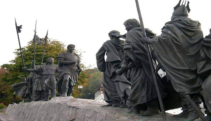 Arxadakı bayraqlar, qurd-əjdaha ağızlı Hun-Türk bayraqları və nizənin ucunda Türk hilalı diqqət çəkir