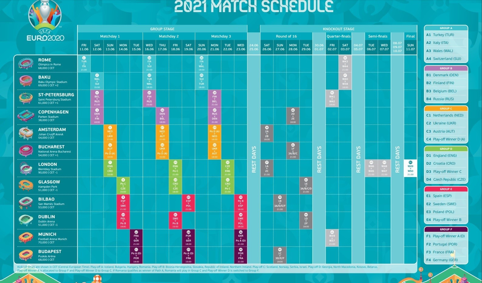 "Report" UEFA-nın rəsmi saytına istinadən xəbər verir ki, Bakı Olimpiya Stadionunun ev sahibliyi edəcəyi oyunlar iyunun 12, 16, 20-si və iyulun 3-də keçiriləcək.