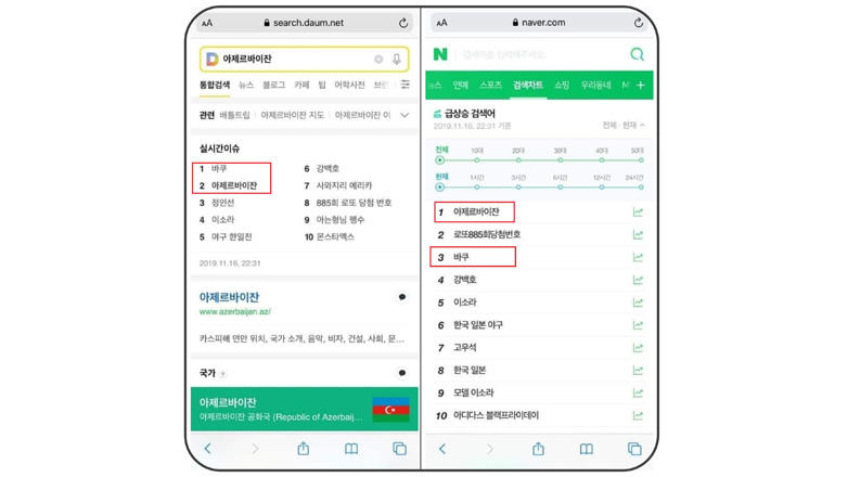 “Azərbaycan və “Bakı” sözləri Cənubi Koreyanın ən böyük axtarış platformaları olan “Naver” və “Daum”da ən çox axtarılan sözlər siyahısında ilk pillələrdə yer alıb.