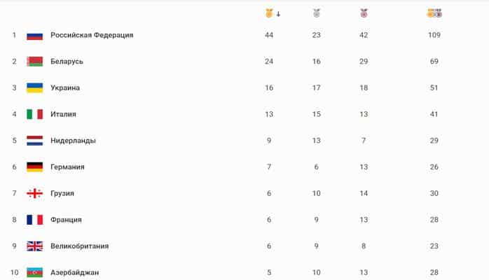 Oyunlarda birinci yeri Rusiya millisi (109 medal), ikinci yeri Belarus millisi (69 medal), üçüncü yeri isə Ukrayna millisi (51 medal) tutublar.