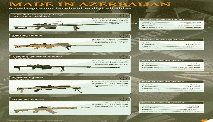 Azərbaycanın hərbi təyinatlı məhsulları ən nüfuzlu silah sərgilərində nümayiş etdirilir. Burada əsas yeri respublikada istehsal olunmuş snayper tüfəngləri tutur.