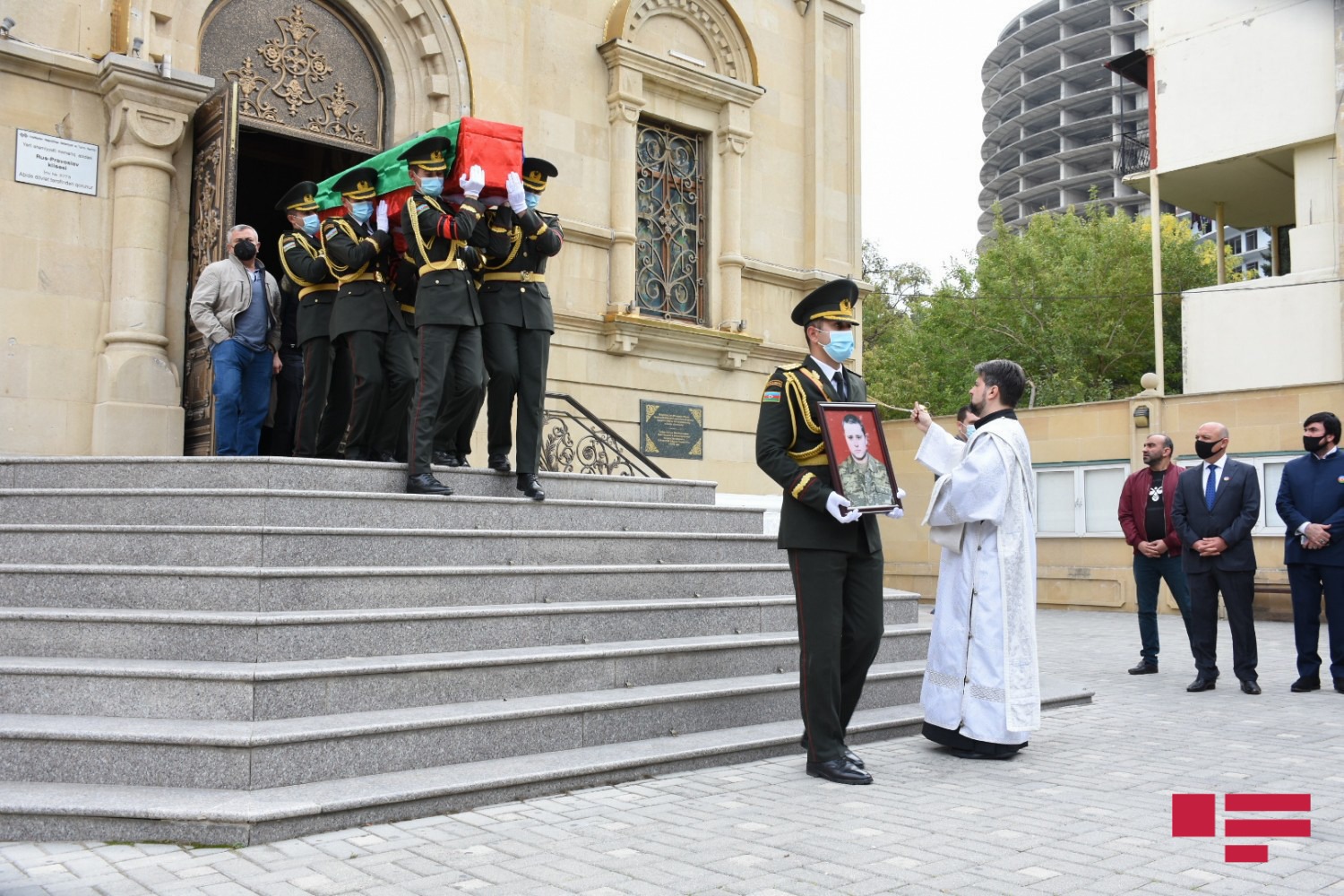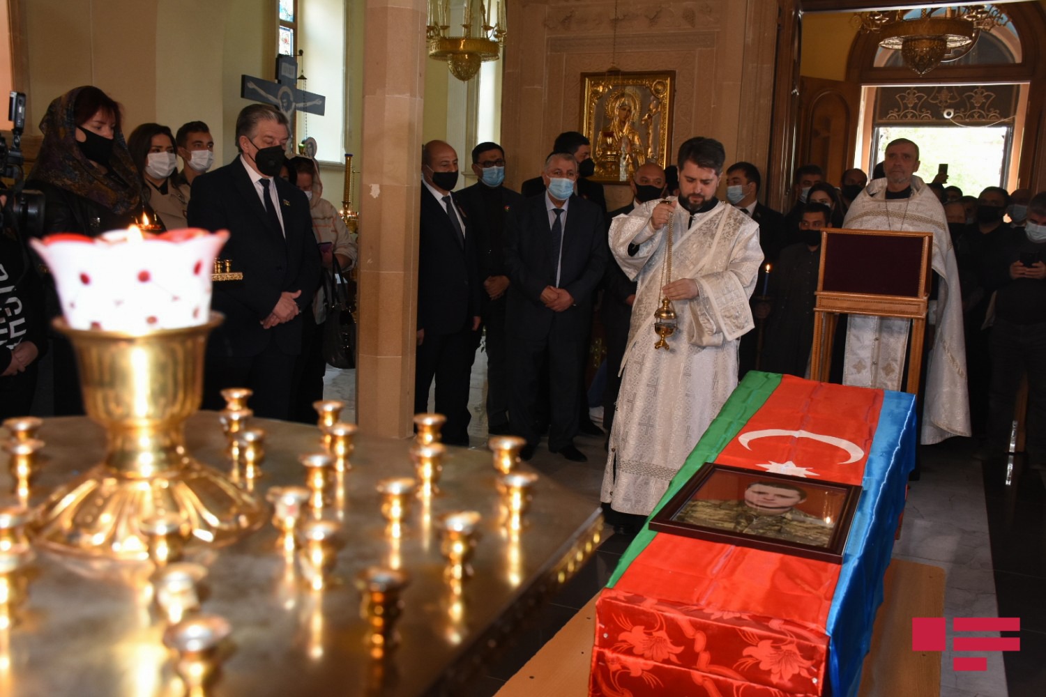 Hərbçimizin cənazəsi Müqəddəs Jen-Mironosits Rus-Pravoslav kilsəsinə aparılıb. Kilsədə dini ayin keçirilib, dualar oxunub.
