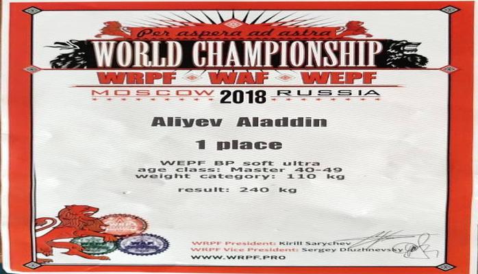 "Report"un məlumatına görə, yarışda Azərbaycanı təmsil edən federasiya prezidenti Ələddin Əliyev (110 kq) qızıl medal qazanıb. Təcrübəli idmançı ümumi nəticədə 240 kq-ın öhdəsindən gələrək, karyerasında ikinci dəfə dünya çempionu olub. O, ilk dəfə dünyanın ən güclüsü adını 20 il əvvəl qazanmışdı.