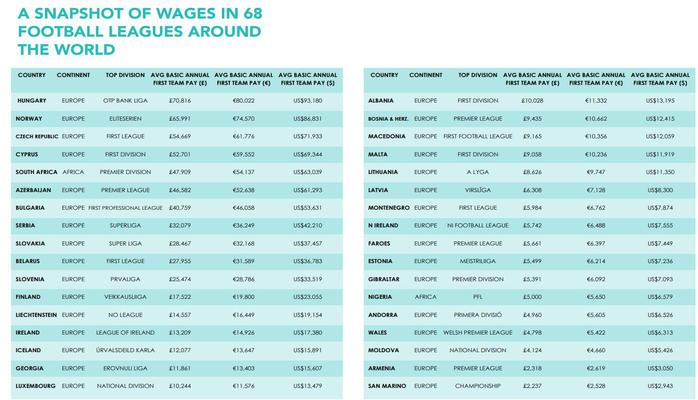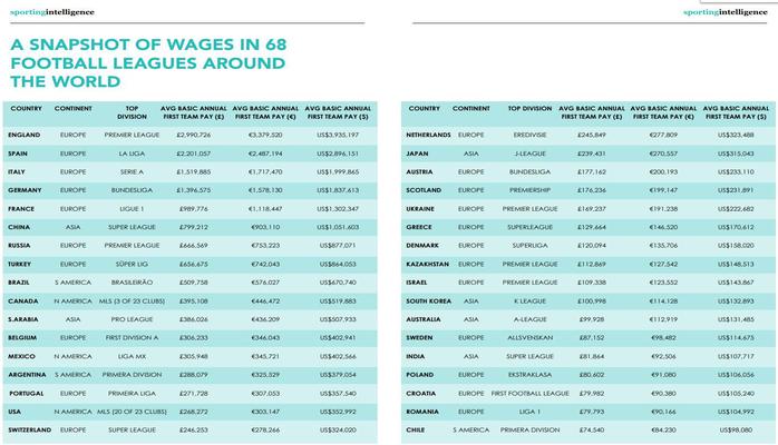Dünyanın 68 ölkə çempionatının qeyd olunduğu siyahıya İngiltərə Premyer Liqası başçılıq edir. Burada orta illik əmək haqqı 3,47 milyon avro təşkil edir. İspaniya La Liqası 2,55 milyon avro ilə ikinci, İtaliya A seriyası isə 1,76 milyon avro ilə üçüncü sıradadır.
