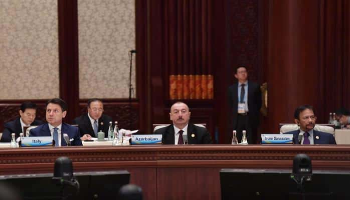 Bu sessiyada çıxış edən Prezident İlham Əliyev dəvətə görə Çin Xalq Respublikasının sədri Si Cinpinə təşəkkür edib. Dövlət başçısı Çin Xalq Respublikasının yaradılmasının 70 illiyi münasibətilə Çin xalqını təbrik edib. Prezident İlham Əliyev vurğulayıb ki, Azərbaycan və Çin tərəfdaş ölkələrdir. Dövlət başçısı 2015-ci ildə Çinə dövlət səfəri zamanı “İpək Yolu İqtisadi Kəməri”nin yaradılmasının birgə təşviqinə dair Anlaşma Memorandumunun imzalandığını qeyd edib.