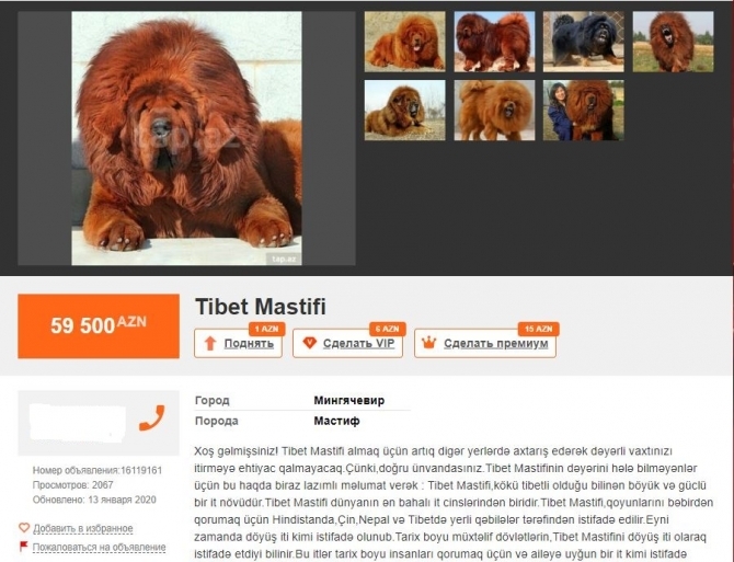BAKU.WS xəbər verir ki, Tibet mastifi cinsi potensial sahiblərinə təklif olunan ən bahalı itdir. Elanlara görə, bu heyvanı almaq istəyən şəxslər yaşından və çəkisindən asılı olaraq 59 min AZN - 1,5 milyon AZN arasında xərc çəkməlidirlər.