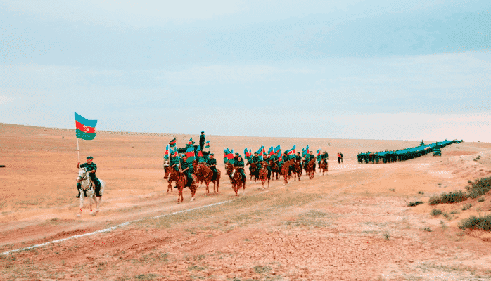 Yürüş iştirakçılarının önündə gedən Qarabağ atlarının sərhədçi süvariləri müqəddəs dövlət bayrağımızı başları üzərində ucaldıblar.