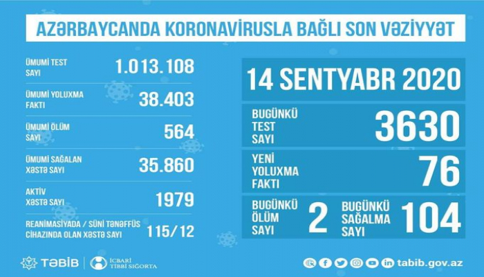 Ens.az xəbər verirki,TƏBİB-dən APA-ya verilən məlumata görə, Azərbaycanda koronavirus (COVID-19) infeksiyasına 76 yeni yoluxma faktı qeydə alınıb, 104 nəfər müalicə olunaraq sağalıb və evə buraxılıb. COVID-19 üçün götürülən analiz nümunələri müsbət çıxmış 2 nəfər vəfat edib.