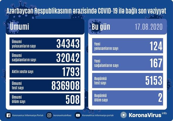 Azərbaycanda koronavirus infeksiyasına 124 yeni yoluxma faktı qeydə alınıb, 167 nəfər müalicə olunaraq sağalıb və evə buraxılıb.
