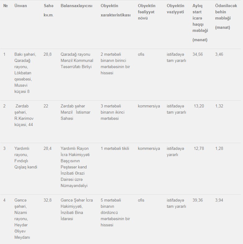Azərbaycanda dövlətə məxsus 4 qeyri-yaşayış sahəsi icarəyə verilir