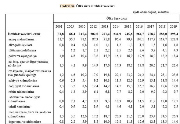 2019-cu ildə istehlak xərclərində ərzaq məhsulları birinci yerdədir. Belə ki, Azərbaycan əhalisi ayda adambaşına 123 manat 80 qəpik ərzağa pul xərcləyir.