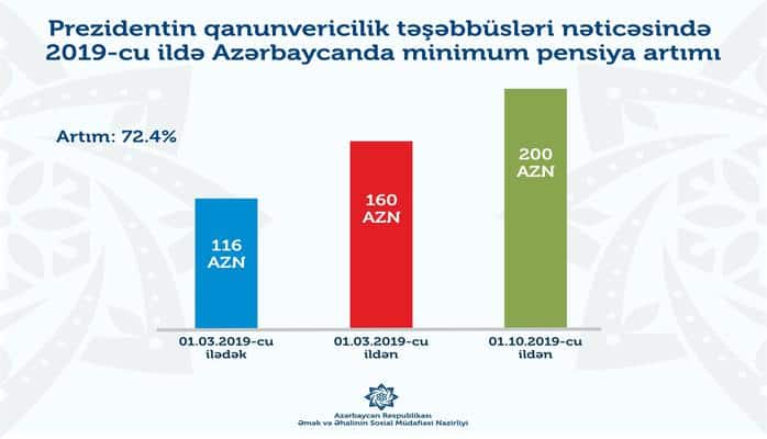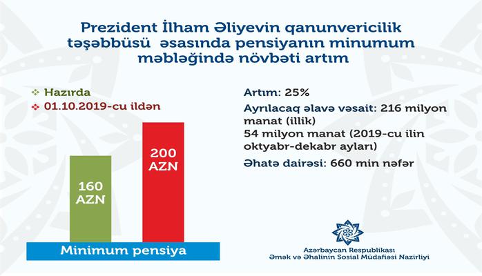 Dövlət başçısının qanunvericilik təşəbbüsü əsasında cari ilin oktyabrın 1-dən pensiyanın minimum məbləği 25 faiz artırılıb. Ümumilikdə, 660 min nəfəri əhatə edəcək pensiya artımı üçün illik əlavə olaraq 216 milyon manat ayrılacaq. Bununla da minimum pensiya 160 manatdan 200 manata çatdırılıb.