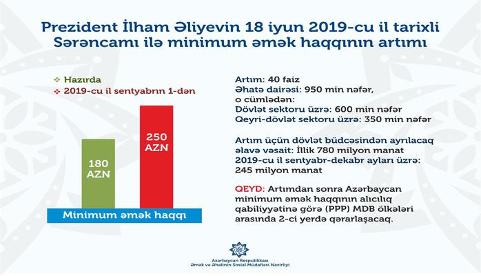 Dövlət başçısının 18 iyun 2019-cu il tarixli sərəncamı ilə minimum əməkhaqqı 40 faiz artırılıb. Ümumilikdə, 950 min nəfəri əhatə edəcək artım üçün dövlət büdcəsindən 780 milyon manat vəsait ayrılacaq. Artımdan sonra Azərbaycan minimum əməkhaqqının alıcılıq qabiliyyətinə görə (PPP) MDB ölkələri arasında ikinci yerdə qərarlaşacaq.
