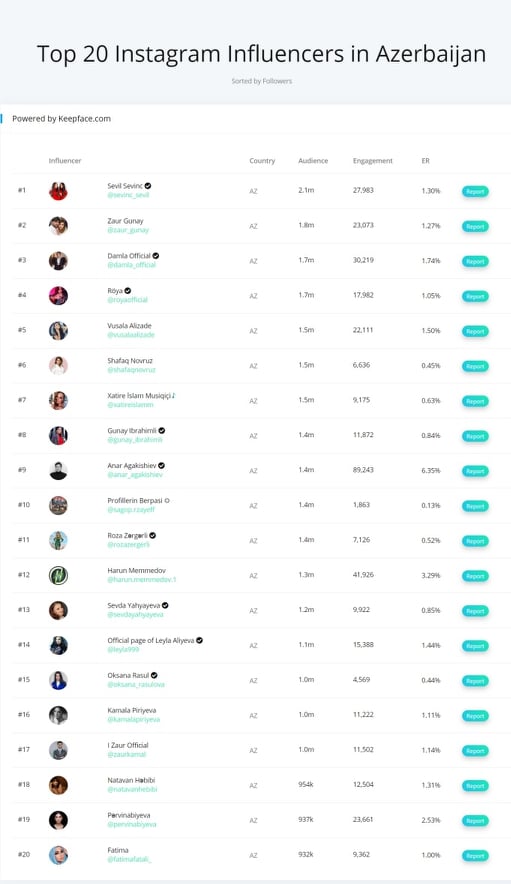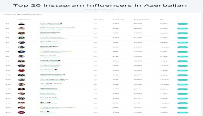 Əlavə edək ki, Keepface platforması “instagram”da izləyici sayına, eləcə də bəyənmə və şərhə bugünədək olan TOP 20-ni bizə özəl olaraq açıqlayıb.