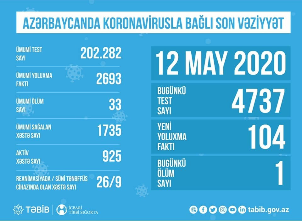 Tibbi Ərazi Bölmələrini İdarəetmə Birliyi (TƏBİB) Azərbaycanda koronavirusla bağlı mayın 12-ə olan statistik göstəriciləri açıqlayıb.