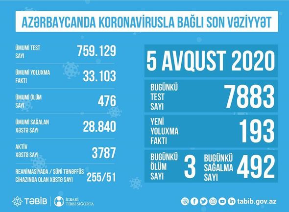 Tibbi Ərazi Bölmələrinin İdarəetmə Birliyindən (TƏBİB) verilən məlumata görə, bu gün 7883 koronavirus testi edilib. Onlardan 193-ü pozitiv çıxıb. Bununla da ölkə ərazisində indiyə qədər edilən koronavirus testlərinin sayı 759 229-a çatıb.
