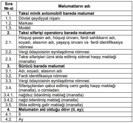 Taksi sifarişi operatorlarının Dövlət Vergi Xidmətinə təqdim etməli olduğu məlumatların siyahısı: