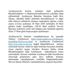 “Report”un məlumatına görə, məlumatda bildirilir ki, Azərbaycanda koronavirusla bağlı vəziyyət səfirlik və baş konsulluq tərəfindən yaxından müşahidə edilir: "Nazirlər Kabineti yanında operativ qərargah ölkədəki bütün təhsil ocaqlarında dezinfeksiya və digər qabaqlayıcı tədbirlərin görülməsi məqsədilə tətilin müddətinin martın 10-dan 20-dək uzadıldığı, martın 20-26-nin Novruz bayramı ilə əlaqədar rəsmi tətil olduğuna görə təhsil ocaqlarında dərslərin faktiki martın 27-də başlayacağını açıqlayıb".