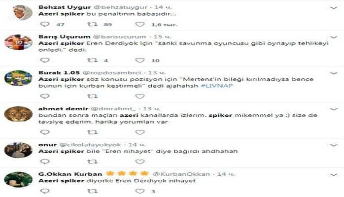 Kult.az xəbər verir ki, türkiyəli azarkeşlər “azərispiker” həştəqi ilə Gündüz Abbaszadənin matçı şərh etməsini çox bəyəndiklərini bildiriblər. Hətta Türkiyənin tanınmış aktyoru Behzad Uyqur da Gündüz Abbaszadənin şərhini qiymətləndirib.