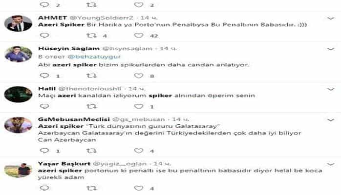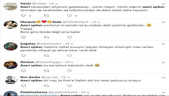 Çempionlar Liqasının D qrupunda baş tutan “Qalatasaray” - “Porto” matçını CBC Sport kanalından izləyən türklər şərhçi Gündüz Abbaszadəni Tvitterdə fenomenə çeviriblər.