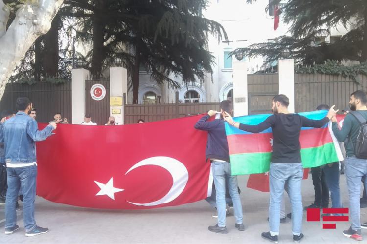 APA-nın yerli bürosunun xəbərinə görə, səfirlik binasının qarşısına toplaşan 100-ə yaxın azərbaycanlı tələbə Türkiyə ordusunun Suriyanın şimalında həyata keçirdiyi antiterror əməliyyatlarına dəstək verdiklərini bildiriblər.
