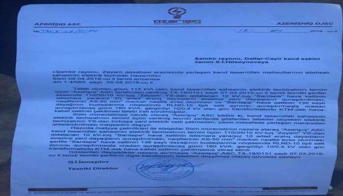 Qurumun vətəndaşa verdiyi texniki şərtdə səbəb kimi Sarıtəpə ərazisində naqillərin əraziyə gətirilməsi üçün işıq dirəklərinin yararsız olması göstərilir.Şikayətçinin sözlərinə görə "Azərişıq" ondan əraziyə 20 ədəd elektrik dirəyinin alınmasını bildirib. Həm də sahibkarın öz vəsaiti hesabına. Hüseynov Tahirin bildirdiyinə görə Nazirlər Kabinetinin 2013cu il qərarına əsasən "Azərişıq"a məxsus işlərin sahibkarlar tərəfindən yerinə yetirilməsi haqqında heç bir maddə yoxdur.