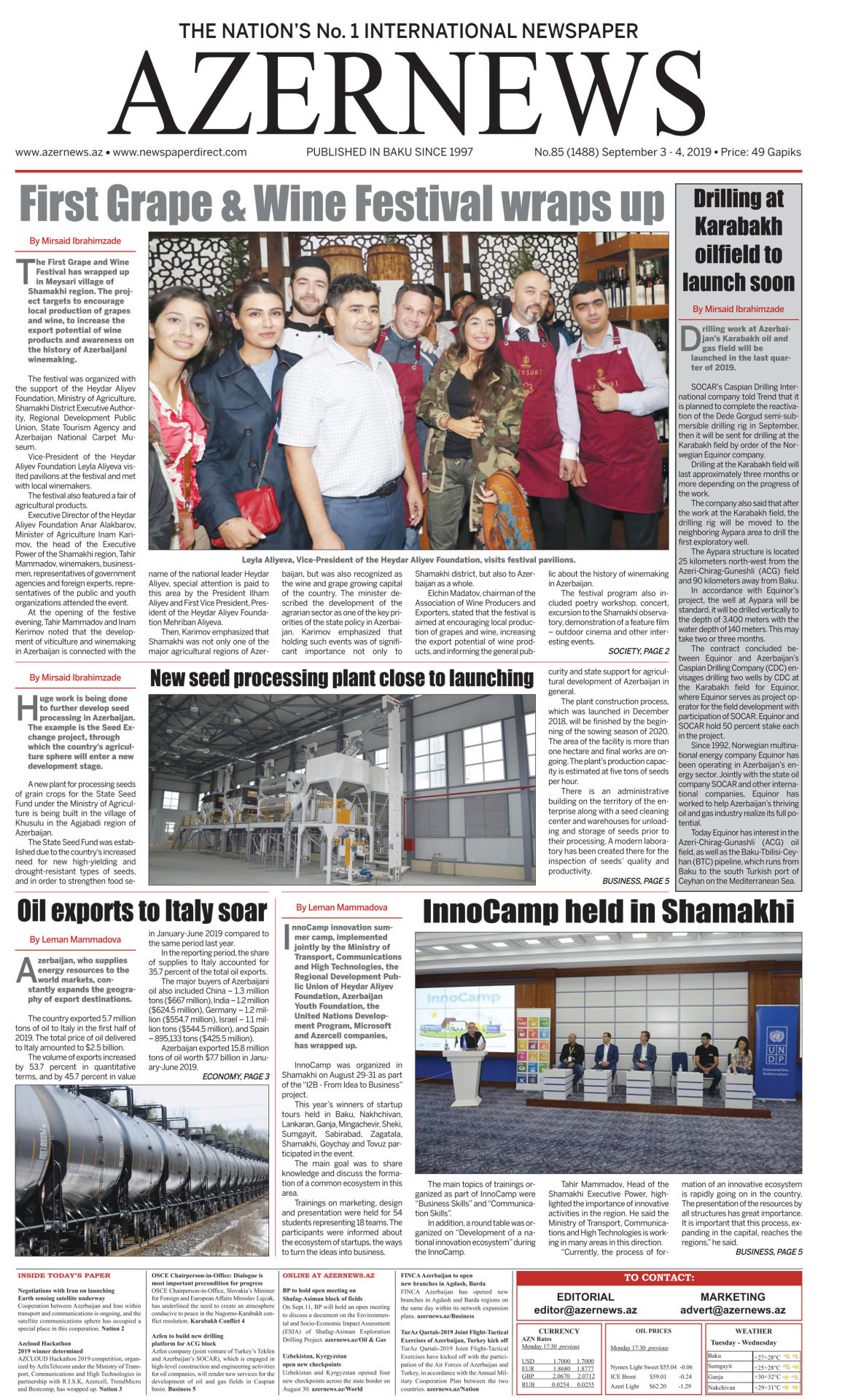 Trend-in məlumatına görə, oxucular qəzetin yeni buraxılışında "İtaliya, Çin və Hindistan Azərbaycan neftinin əsas alıcılarıdır"; "Şərab ixracının həcmi açıqlandı"; "Ölkədə innovativ ekosistem formalaşır"; "İlk Dağ Yəhudiləri Muzeyi tezliklə açılacaq" və digər məqalələrlə tanış ola bilərlər.