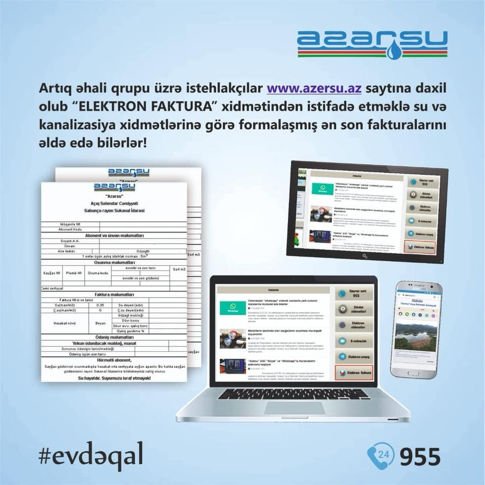 Qeyd edək ki, "Elektron faktura” xidmətindən istifadə ilə əyani tanış olmaq üçün “Azərsu” ASC-nin facebook səhifəsində videoçarx, eyni zamanda azersu.az saytının elektron xidmətlər bölməsində təlimat yerləşdirilib.