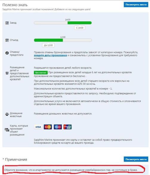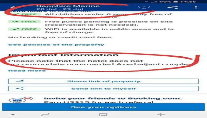 Otel əcnəbiləri açıq şəkildə ölkə vətəndaşlarından üstün tutaraq, otellərin bron olunması üçün dünyada ən çox istifadə olunan Booking.com saytında bu barədə elan yerləşdirib: