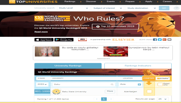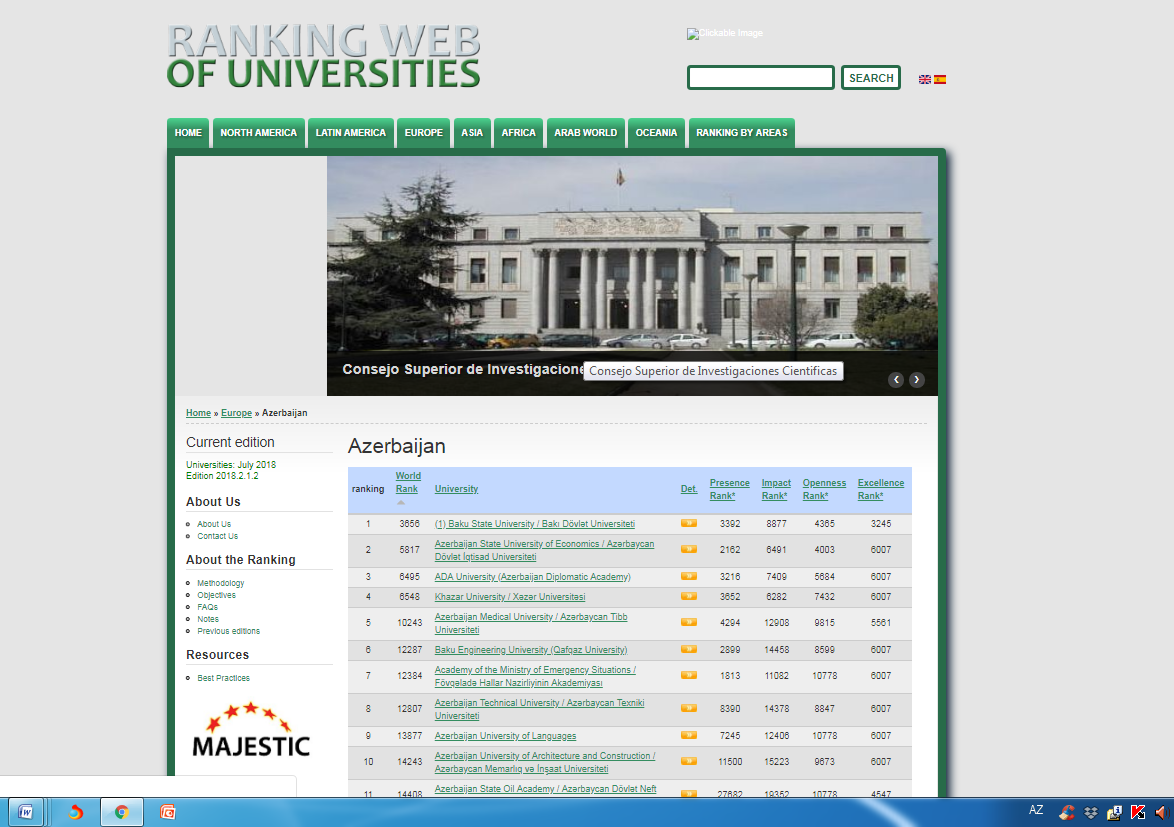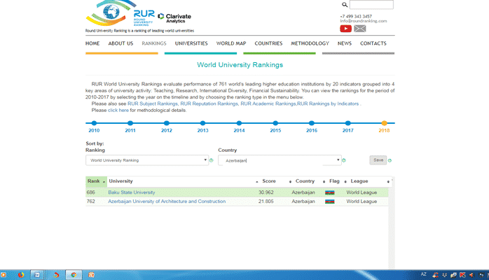 Bakı Dövlət Universitetindən (BDU) Trend-ə verilən məlumata görə, dünyanın 20 min top universitetini araşıdıran şirkət siyahıya yalnız 1000 top universiteti daxil edib. 2018-ci il sentyabr ayının nəticələrinə əsasən Azərbaycandan yalnız BDU reytinqdə 801+ yerdə qərarlaşıb. Reytinqin tərtib olunmasında akademik aləmdən olan ekspertlərin rəyi, professor-müəllim heyətinin tələbələrin sayına nisbəti, işəgötürənlər arasında reputasiyası, sitat gətirilmə indeksi, həmçinin xarici müəllim və tələbələrin sayı nəzərə alınır.