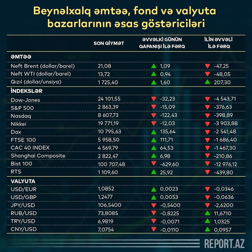 Beynəlxalq əmtəə, fond və valyuta bazarlarının əsas göstəriciləri (29.04.2020)
