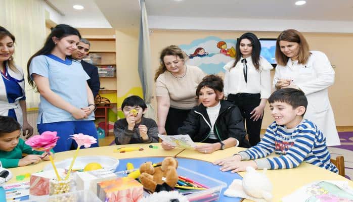 Doqquz yaşlı Ömərlə birgə rəsm çəkən birinci xanım Mehriban Əliyeva onun bacarıqlı olduğunu dedi. Heydər Əliyev Fondunun prezidenti uşaqların müalicəsi üçün tətbiq edilən prosedurları izlədi, müalicə zamanı istifadə olunan üsullarla maraqlandı. Mehriban xanım Əliyeva xüsusi qayğıya ehtiyacı olan 6 yaşlı Nasimin də istək və arzularını dinlədi, oyun vasitəsilə onun suallarını cavablandırdı. Tibb müəssisəsinin digər balaca pasiyenti Abdullanın müalicəsi isə filtrasiya olunan musiqinin xüsusi qulaqcıqlarla dinlənilməsinə əsasən beyinə impulsların ötürülməsi ilə aparılır.