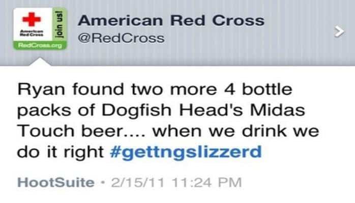 “American Red Cross” (Amerika Qırmızı Xaç Komitəsi) təşkilatının işçilərindən biri öz şəxsi hesabının əvəzinə səhvən təşkilatın rəsmi Twiter hesabından tweet atıb. Bir afişa və sərxoş bir dost haqqında olan bu tweet, diqqət yetirilib silinənə qədər bir saatdan çox vaxt ərzində “American Red Cross”təşkilatının hesabında qaldı. Əslində bu tweet təşkilatın icimini korlayacaq məzmunda deyildi.