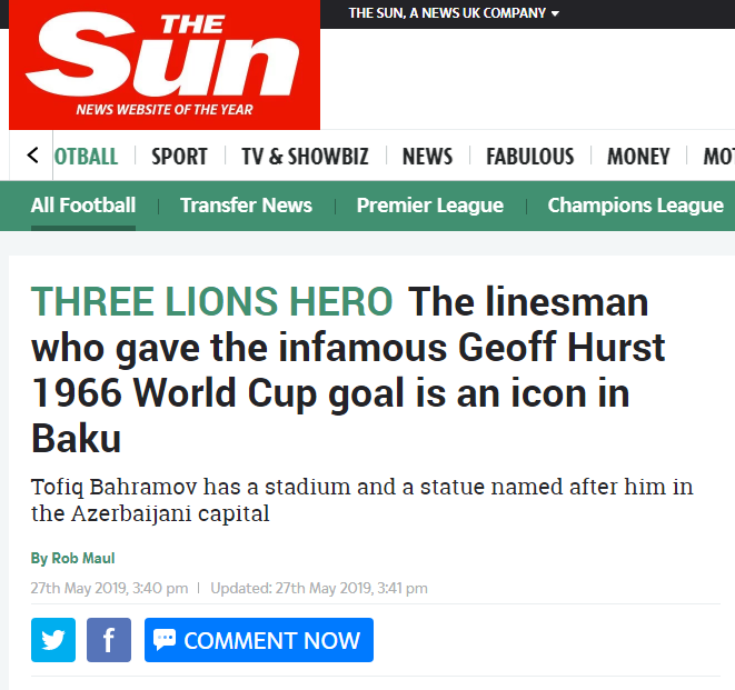 Milli.Az xəbər verir ki, Britaniyanın nüfuzlu "The Sun" nəşri Tofiq Bəhramov haqqında yazı dərc edib. Jurnalist Rob Maulun yazdığı məqalədə Tofiq Bəhrəmovun arxiv şəkillərindən istifadə olunub.
