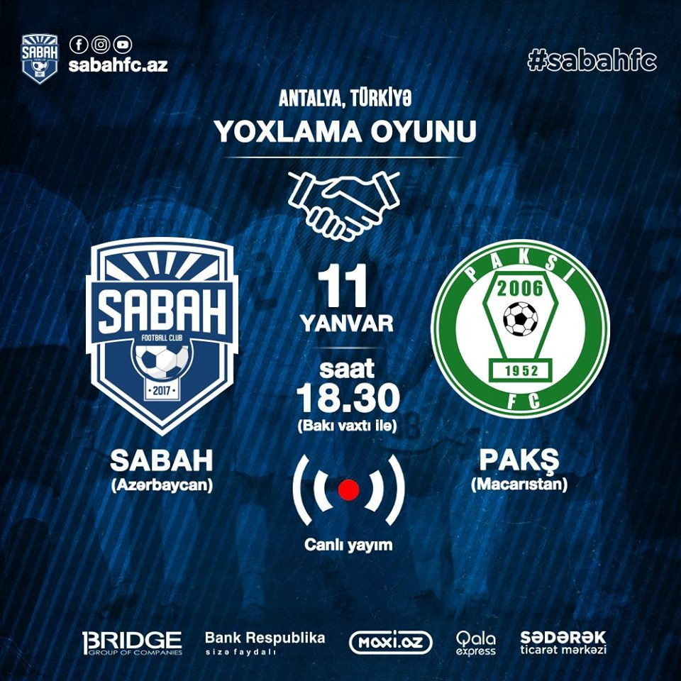 "Sabah" isə Belek qəsəbəsindəki "Titanik Mardan" stadionunda Macarıstan "Pakş"ı ilə üz-üzə gələcək. Saat 18:30-da start götürəcək matç “Sabah” FK-nın “youtube” kanalı vasitəsilə canlı yayımlanacaq.