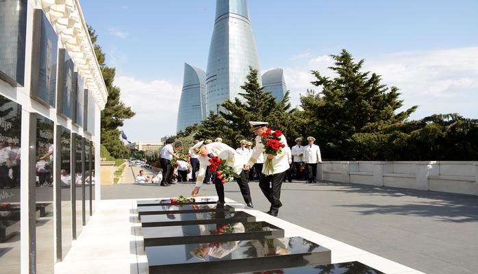 Sonra Şəhidlər xiyabanına gələn ziyarətçilər Azərbaycanın müstəqilliyi və ərazi bütövlüyü uğrunda mübarizədə canlarından keçən qəhrəman Vətən övladlarının, o cümlədən dənizçilərin xatirəsini ehtiramla yad edib, məzarları üzərinə gül dəstələri düzüb, “Əbədi məşəl” abidəsinin önünə əklil qoyublar.