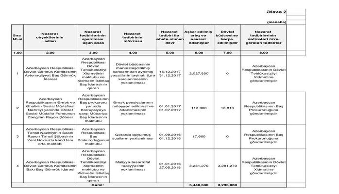 Eyni zamanda, 2019-cu ilin birinci yarısında Dövlət Maliyyə Nəzarəti Xidmətinin mütəxəssisləri tərəfindən hüquq-mühafizə və prokurorluq orqanlarının məktublarına, məhkəmələrin qərarlarına əsasən 4 təşkilatda (Əlavə 2) aparılmış yoxlamalarla 5440,63 min manat məbləğində artıq və əsassız ödənişlər aşkar edilib, təqsirkar şəxslər hesabına həmin vəsaitin 3295,08 min manatının bərpası təmin olunub, müvafiq sənədlər aidiyyəti üzrə təqdim edilib.