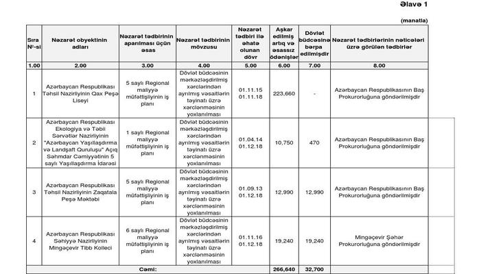 Nazirlikdən Trend-ə verilən məlumata görə, 2019-cu ilin birinci yarısında, dövlət büdcəsindən maliyyələşən 2 rayon icra hakimiyyətinə, 1 şəhər sahə ərazi nümayəndəliyinə, 1 təhsil müəssisəsinə, 2 məhdud məsuliyyətli cəmiyyətə, eyni zamanda, bir neçə şəhər və rayonlarda yerləşən büdcə təşkilatlarına ayrılmış vəsaitlərin təyinatı üzrə xərclənməsi üzrə nəzarət tədbirləri həyata keçirilib.