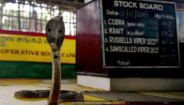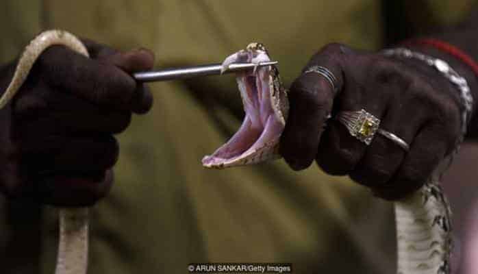 "Bir hər ilanı 21 gün saxlayırıq və həmin müddət ərzində dörd dəfə zəhər çəkirik," Rajendran deyir.