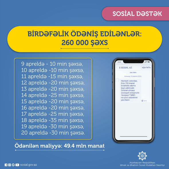 Əmək və Əhalinin Sosial Müdafiəsi Nazirliyi tərəfindən aprelin 9-dan gündəlik olaraq birdəfəlik ödənişlər həyata keçirilir. Artıq 260 min nəfər üçün ödəniş edilib və bunun üçün 49,4 milyon manat vəsait köçürülüb.