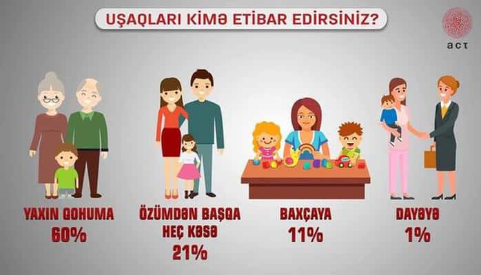 Oxu.Az “ACT Azərbaycan”a istinadən xəbər verir ki, rəyi öyrənilmiş 400 paytaxt sakininin yarıdan çoxu (60%) uşaqların yaxın qohumlara (nənə, xala, bibi) etibar olunmasını doğru sayır. Respondentlərin beşdə biri (21 %) körpələrini kiməsə etibar etmir. Uşaqları dayələrə həvalə edənlər sorğuda cəmi 1% rəy qazana biliblər.