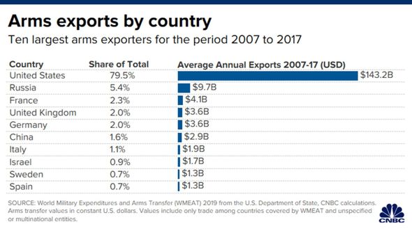2007-2017-ci illərdə ABŞ-ın orta illik silah satışları 143,2 milyard, növbəti yerlərdə gələn Rusiyanın 9,7 milyard, Fransanın 4,1 milyard, İngiltərənin 3.6 milyard, Almaniyanın 3, 6 milyard, Çinin 2.9 milyard dollar həcmində olub.
