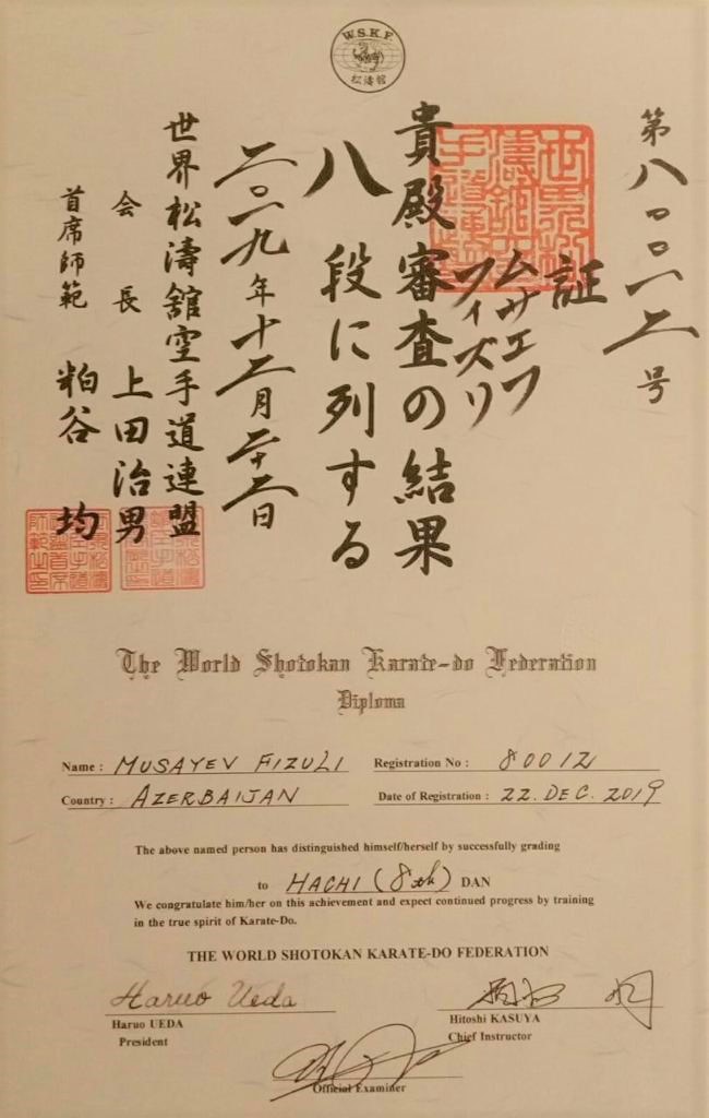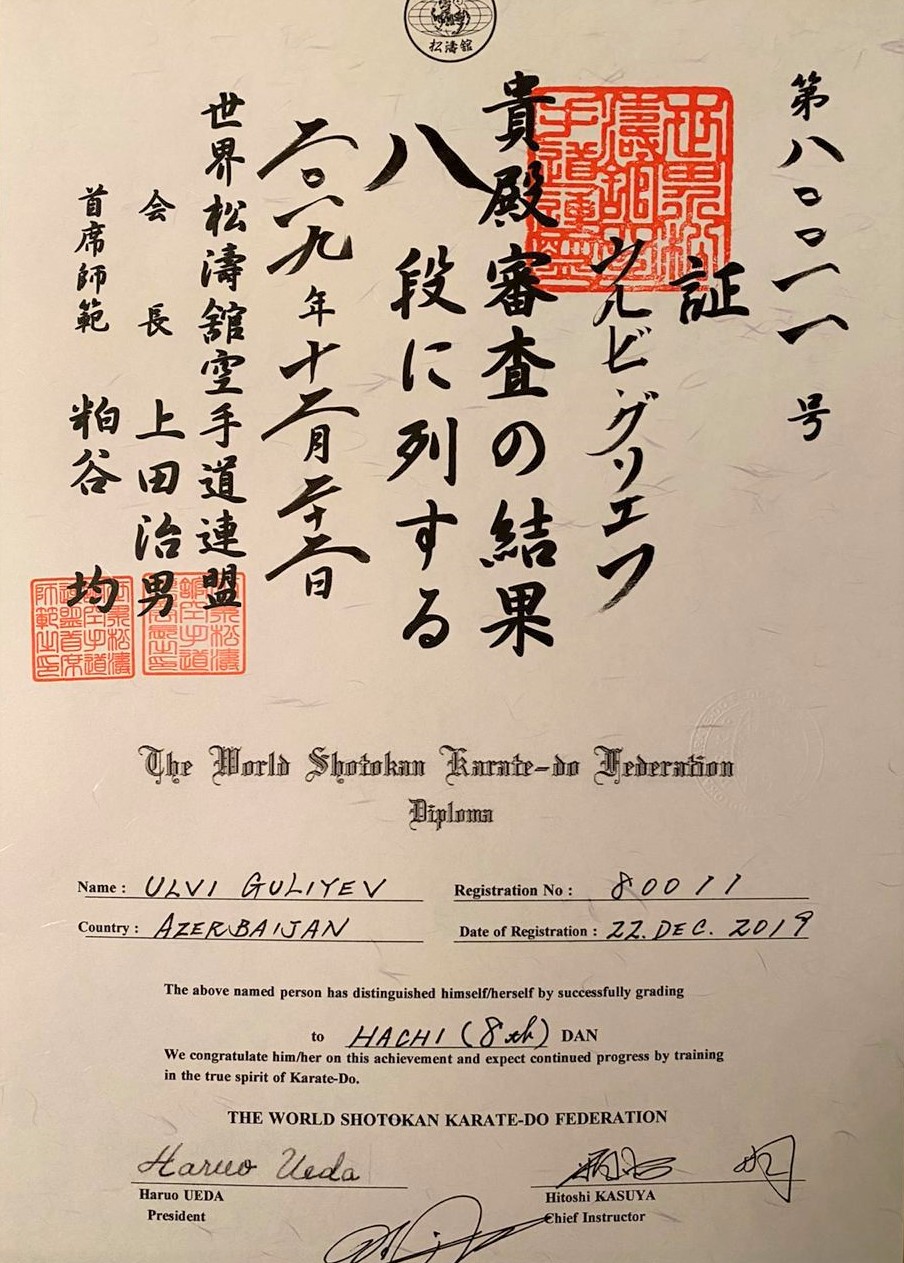 22 dekabr 2019-cu il tarixində Dünya Şotokan Karate Federasiyasının (WSKF) Texniki komitəsinin qərarı ilə Avropa və Dünya çempionlarımız Ülvi Quliyev və Füzuli Musayev karatenin inkişafında xüsusi xidmətlərinə görə 8-ci dan (Şixan) qara kəmər dərəcəsinə layiq görülüblər. Qeyd edək ki, Ülvi Quliyev və Füzuli Musayev karateçilərə rəhbərlikləri dövründə bir çox sayda Azərbaycan gəncləri Avropa və Dünya çempionu adlarını qazanaraq tarixə yazılmışlar. Artıq bütün dünyada tanınıb qəbul edilən Azərbaycan karate məktəbinin təməlində Ülvi Quliyevin və Füzuli Musayevin danılmaz xidmətləri, mübarizə və qələbə əzmi nümunəsi də dayanır.