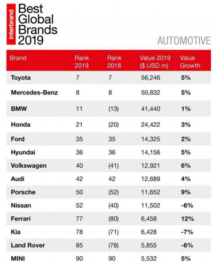 2019-cu il reytinqində 14 avtomobil nəhəngi yer alıb. Ferrari keçən illə müqayisədə ən yüksək nəticəni göstərib, Kia isə dəyərinin 7%-ni itirib.