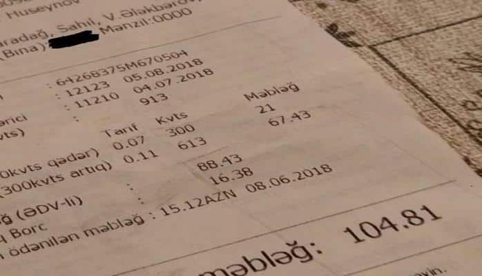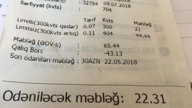 Bakının Qaradağ rayonunda yaşayan Vaqif Hüseynov BBC News Azərbaycancaya deyib ki, elektrik enerjisi istifadəsinə görə hər ay 15-16 manatlıq qəbzlər gəlsə də də, iyul ayı üçün bu göstərici 88 manat olub.