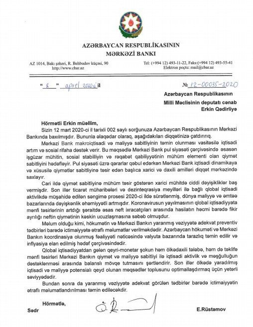 Baş bankir cavabında təmsil etdiyi qurumun həyata keçirdiyi siyasətin qiymət sabitliyini hədəflədiyini də açıqlayıb: